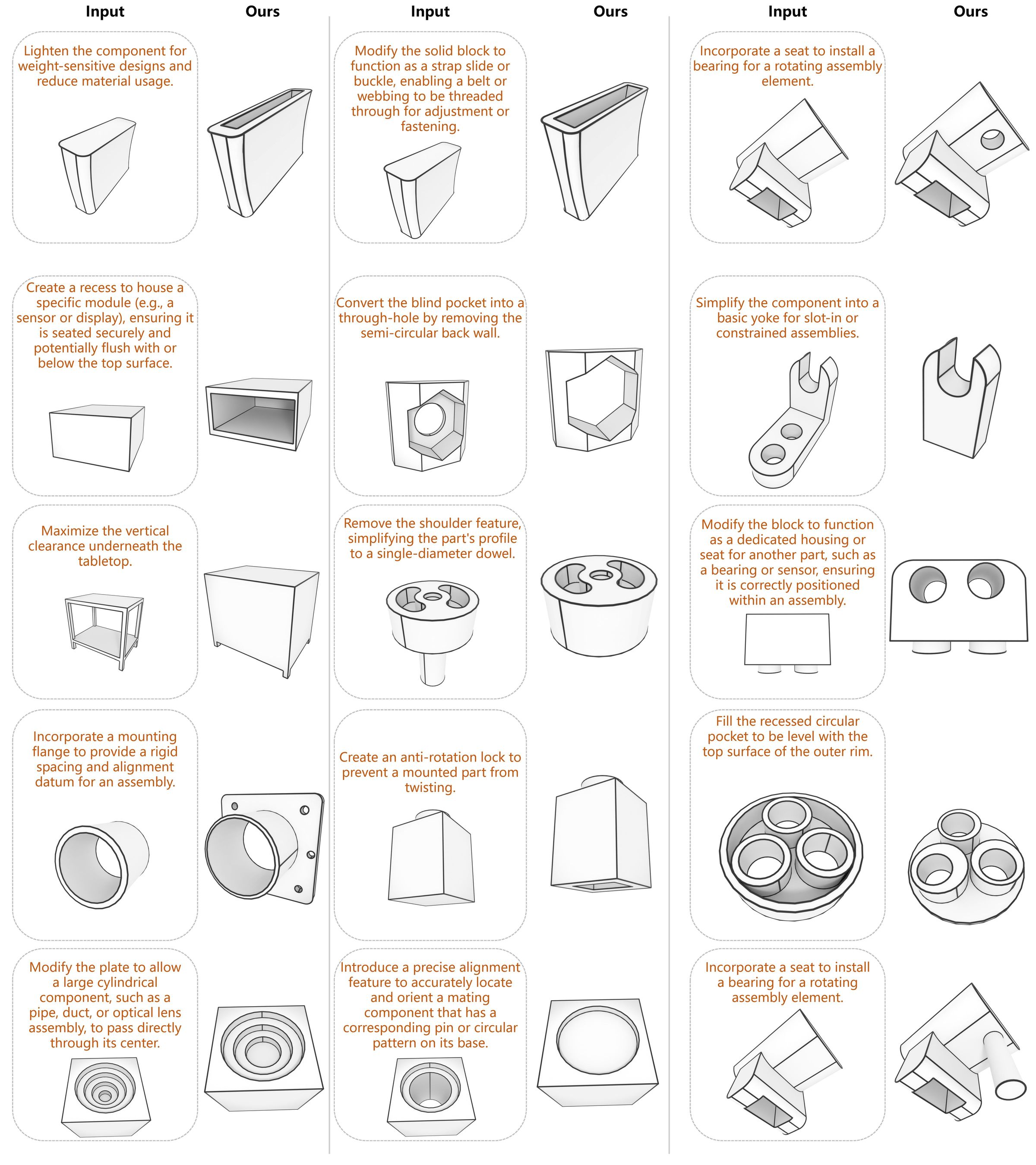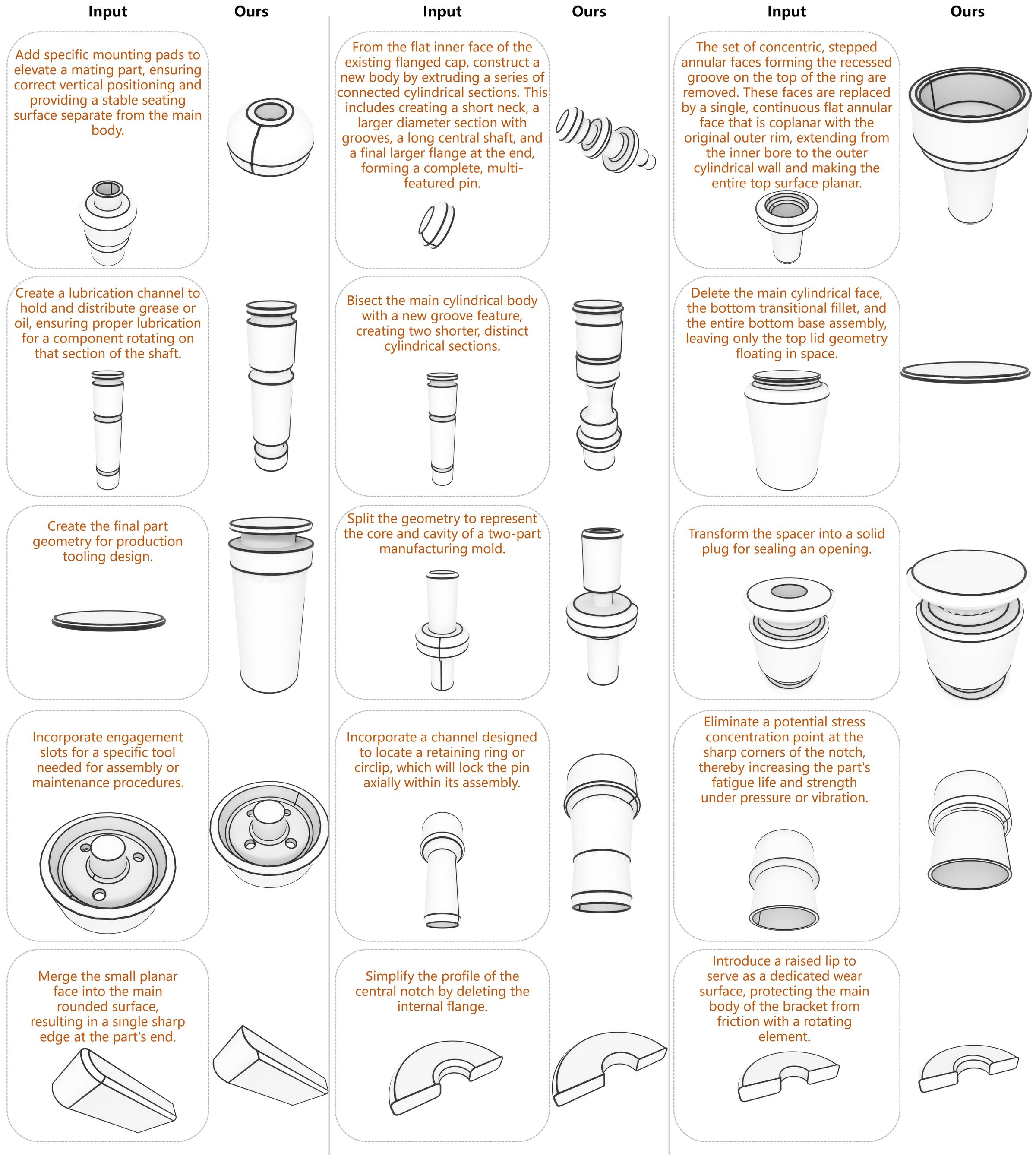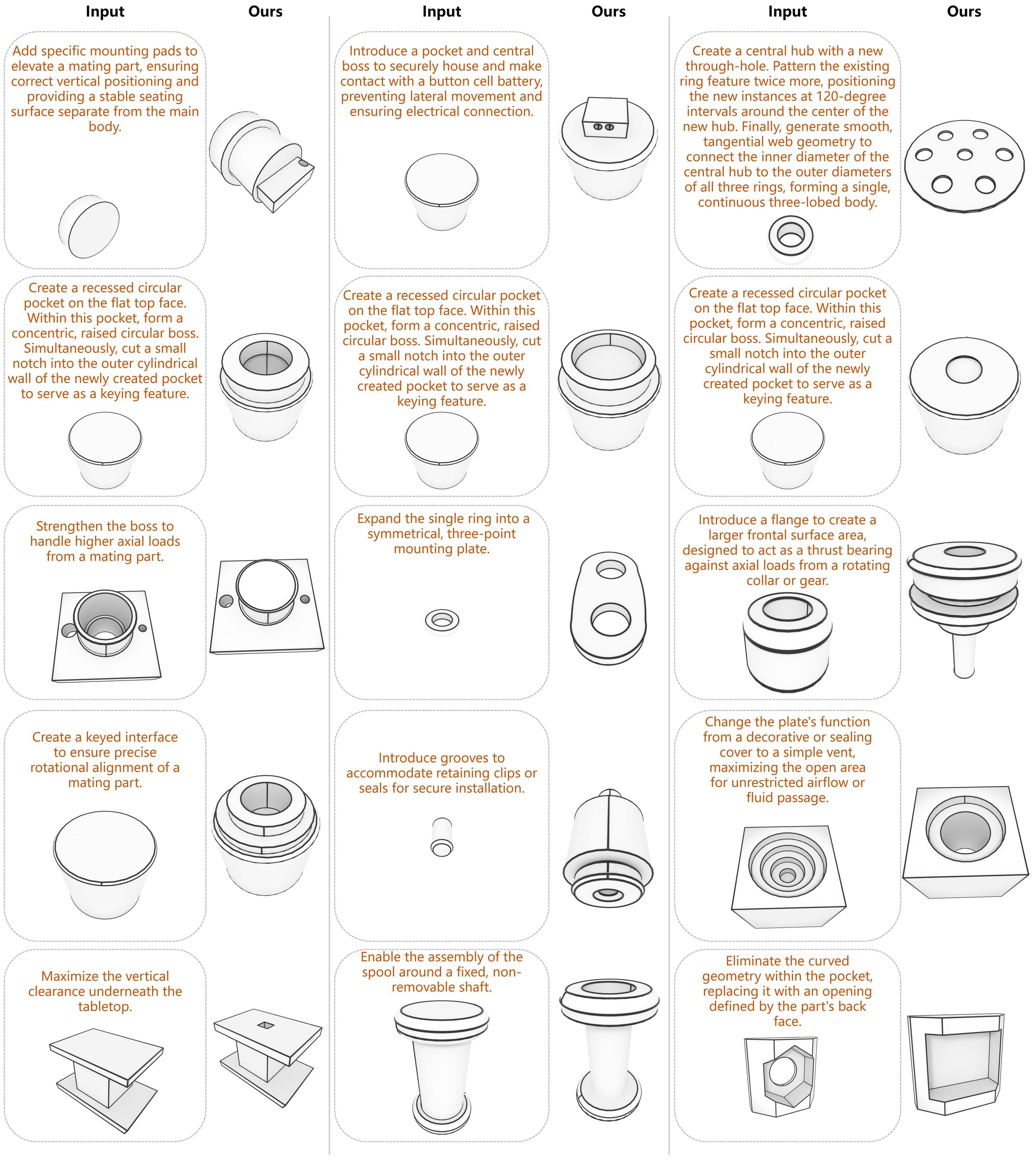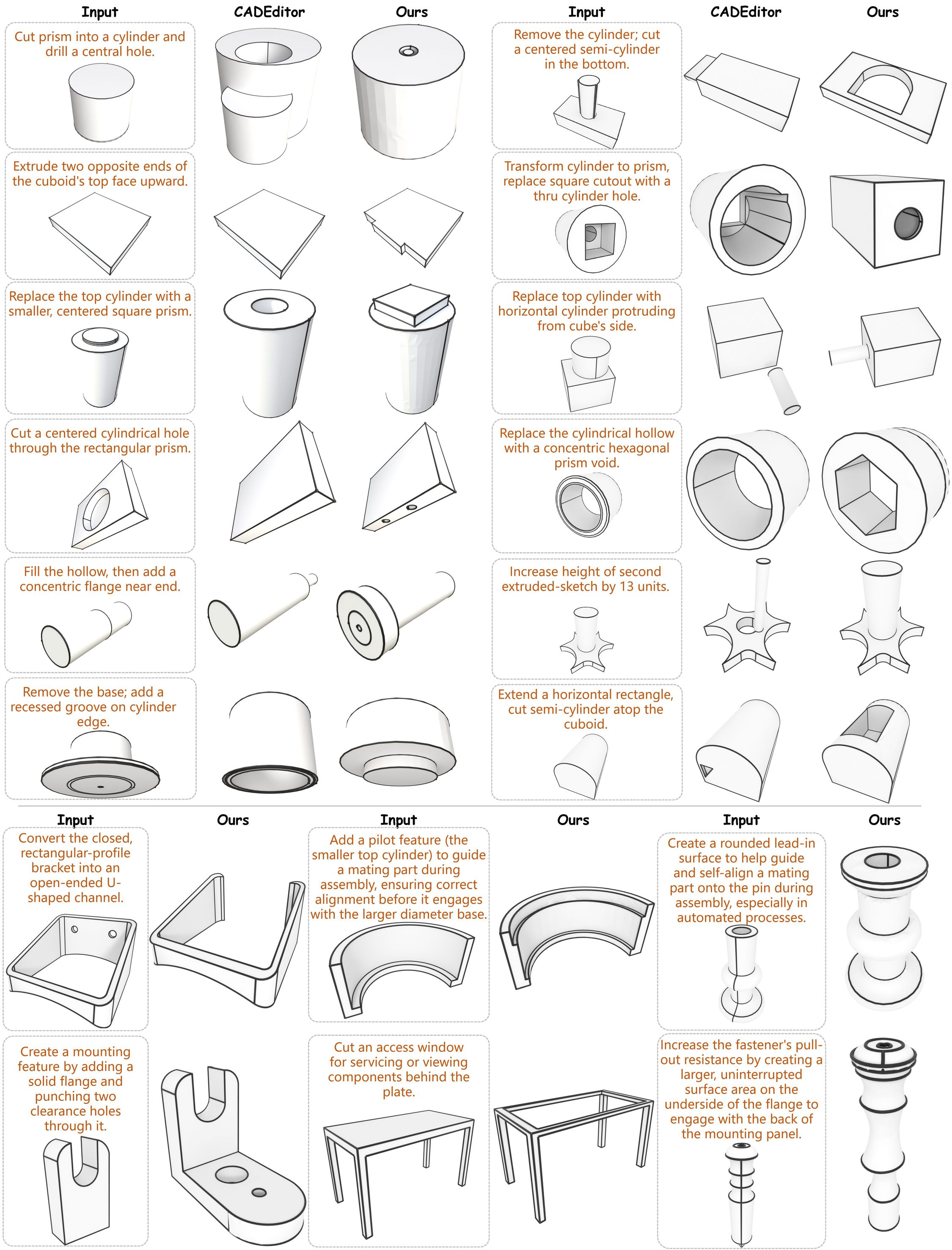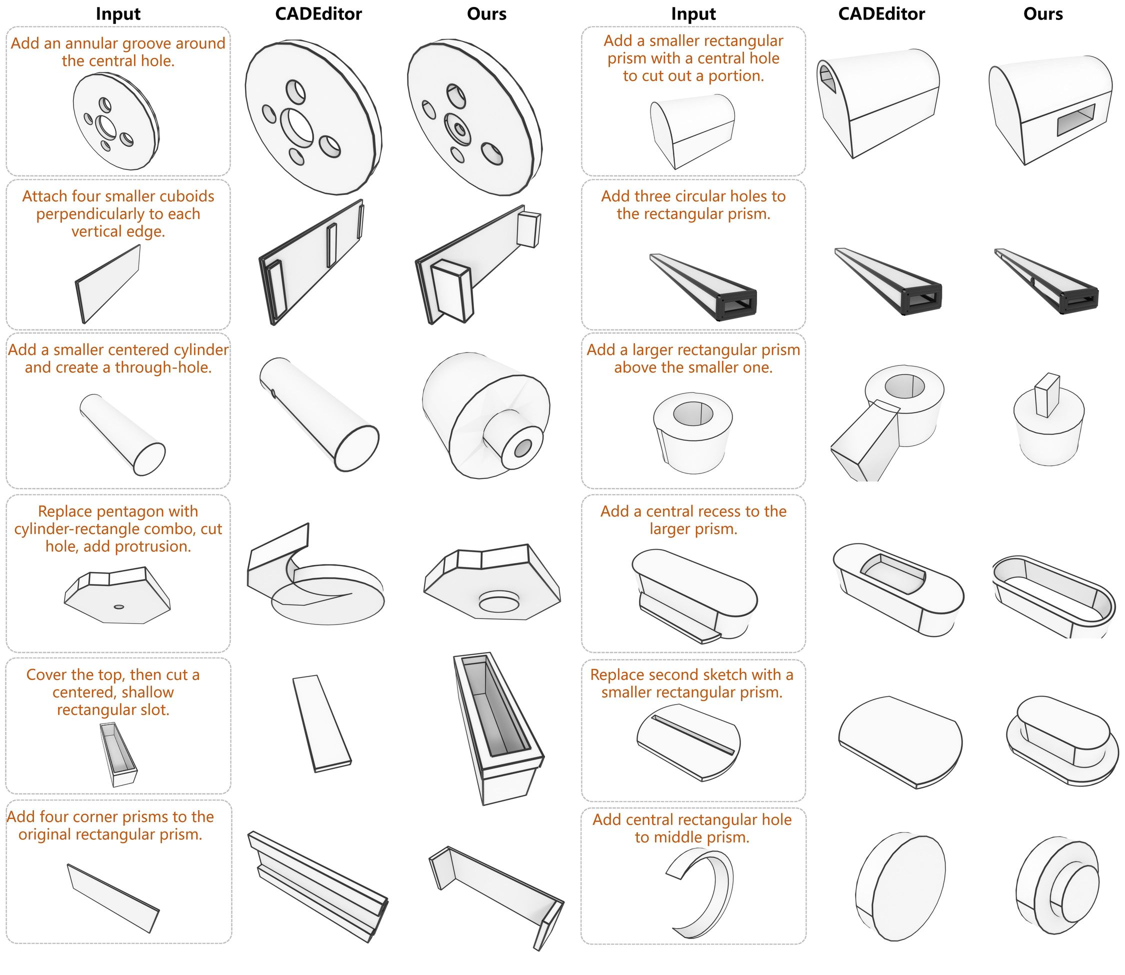 Computer-Aided Design (CAD) models, given their compactness and precision, remain the industry standard for designing and fabricating engineering objects. However, language-guided CAD editing is still in its infancy, largely due to missing semantic connection between user commands and underlying shape geometry, a problem exacerbated by the shortage of paired text-and-edit CAD datasets. While recent Multimodal Large Language Models (mLLMs) have attempted to bridge this gap, their reliance on CAD construction history -often an expensive and hard to obtain input- severely limits their expressiveness and restricts their usage.